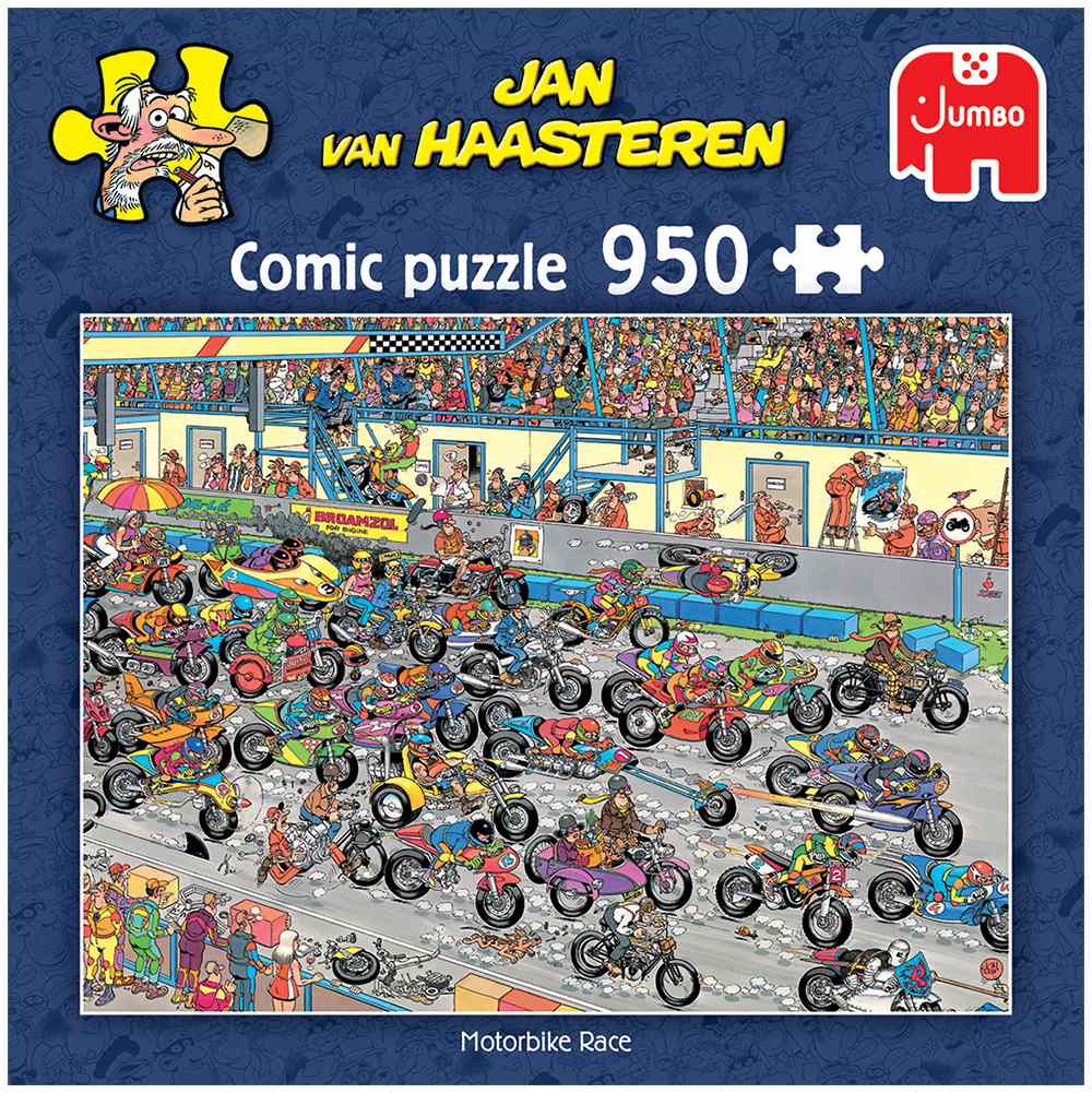 Start your engines and join the race in this thrilling motorbike race. Jan van Haasteren goes old school on his antique motorbike.