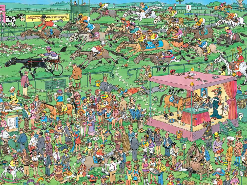 Welcome to the most hilarious racetrack at Ascot! Chaos reigns on the track: One horse watches carefully to see how it should be done, while another simply runs off the track, and a third even has wings. Meanwhile, the jockeys try to stay upright, and the ladies, wearing their extravagant hats, compete to outdo each other with the most bizarre creations.