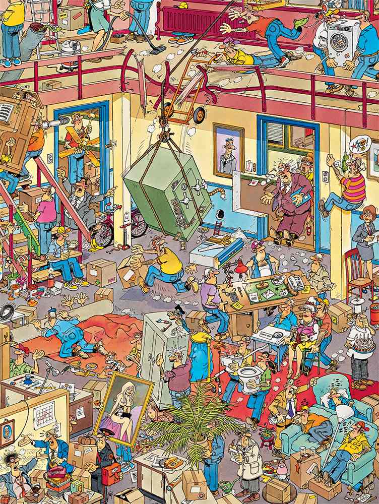 At this company, the move has completely spiraled out of control. Paint cans, boxes and furniture are blocking every path, while employees haul around just about anything they can find. People walk by carrying a toilet under their arm, as if that were the most normal thing in the world. On the staircase, lunch is being eaten right in the middle of the moving boxes. Meanwhile, even the postal worker squeezes through the chaos to complete his round. And as if that weren’t enough, a section of the wall has been cut out to get a huge safe outside. Typically Jan van Haasteren: total chaos, small visual jokes, and endless details to discover.