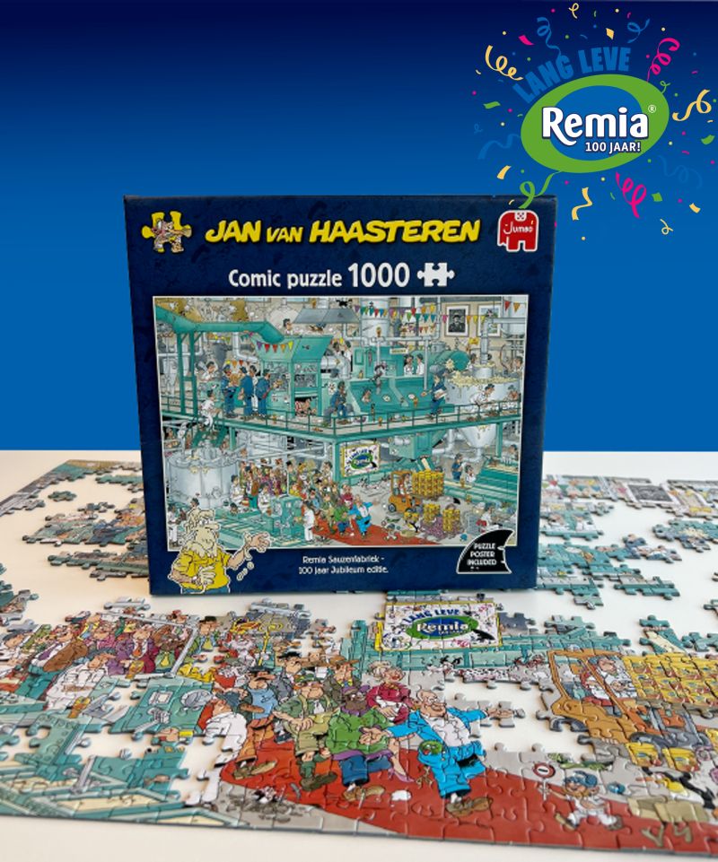 Company Remia is celebrating its 100th Anniversary! To celebrate this milestone, Remia is launching a unique Jan van Haasteren puzzle together with Jumbo and JvH-puzzles: "Remia Sauce Factory - 100th anniversary Edition'' with 1000 pieces. The puzzle is based on the 2013 release The Chocolate Factory” illustrated by Jan van Haasteren. For Remia, the image has been completely recolored and enhanced by Mars Gremmen, incorporating the classic features of a Jan van Haasteren puzzle. The puzzle is also personalized with the Remia logo and, of course, the (well-known) Remia products.